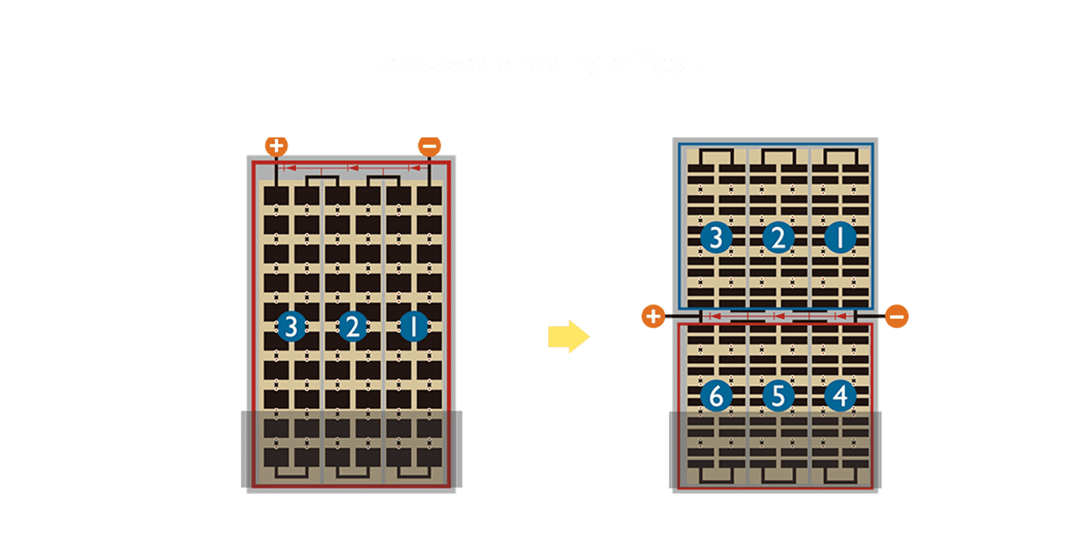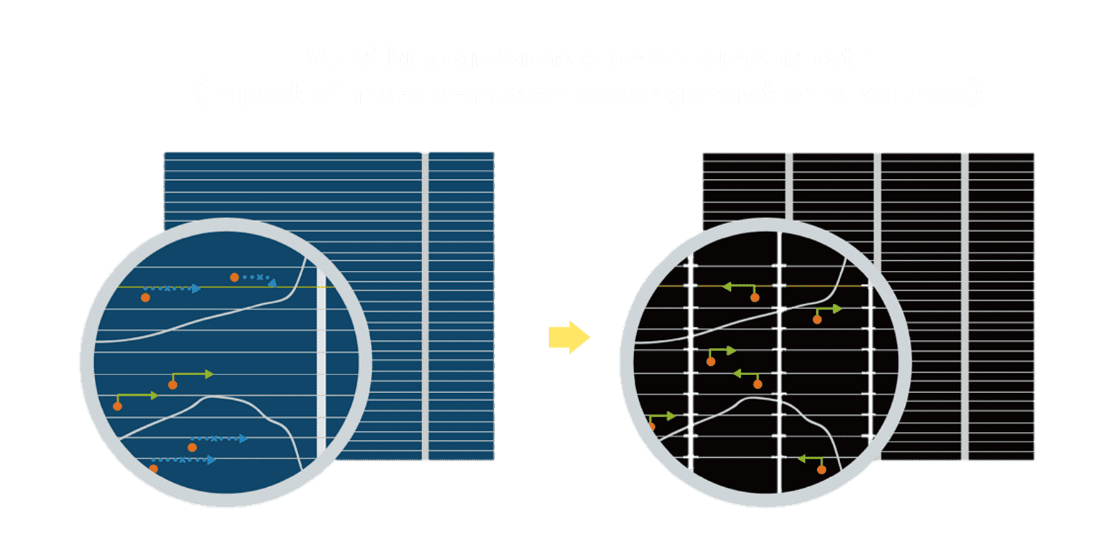 - 电池使用多条铜导线 (Copper wire) 于电池片上形成较短的电流路径,,,,提高电流收集效率,,采用圆形设计的铜导线较传统扁平式的铜焊带 (Ribbon),,,可增加入射至电池的光线量。。