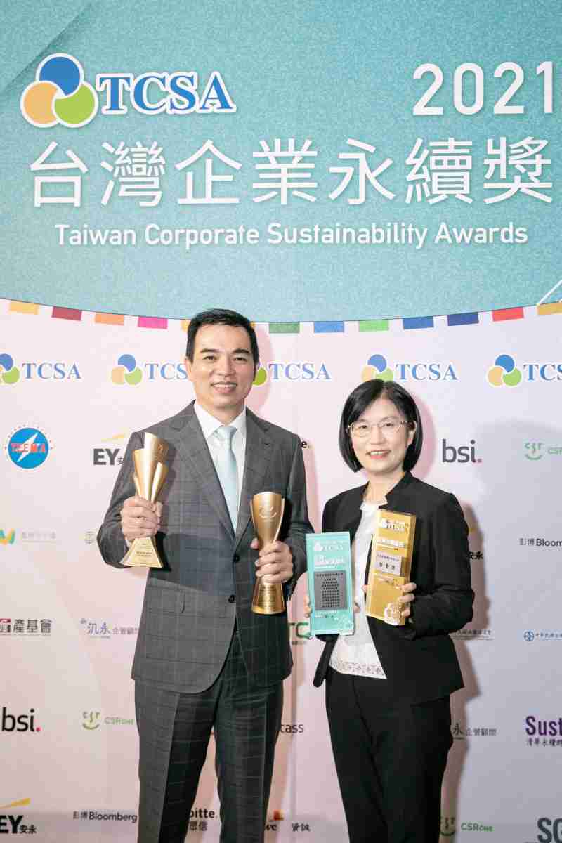达在台湾永续奖所评比环境、、、、社会、、、治理等各面向的永续绩效均获高度肯定 (左:尊龙集团光电总经理暨营运长柯富仁,,,,右:尊龙集团光电永续长古秀华)