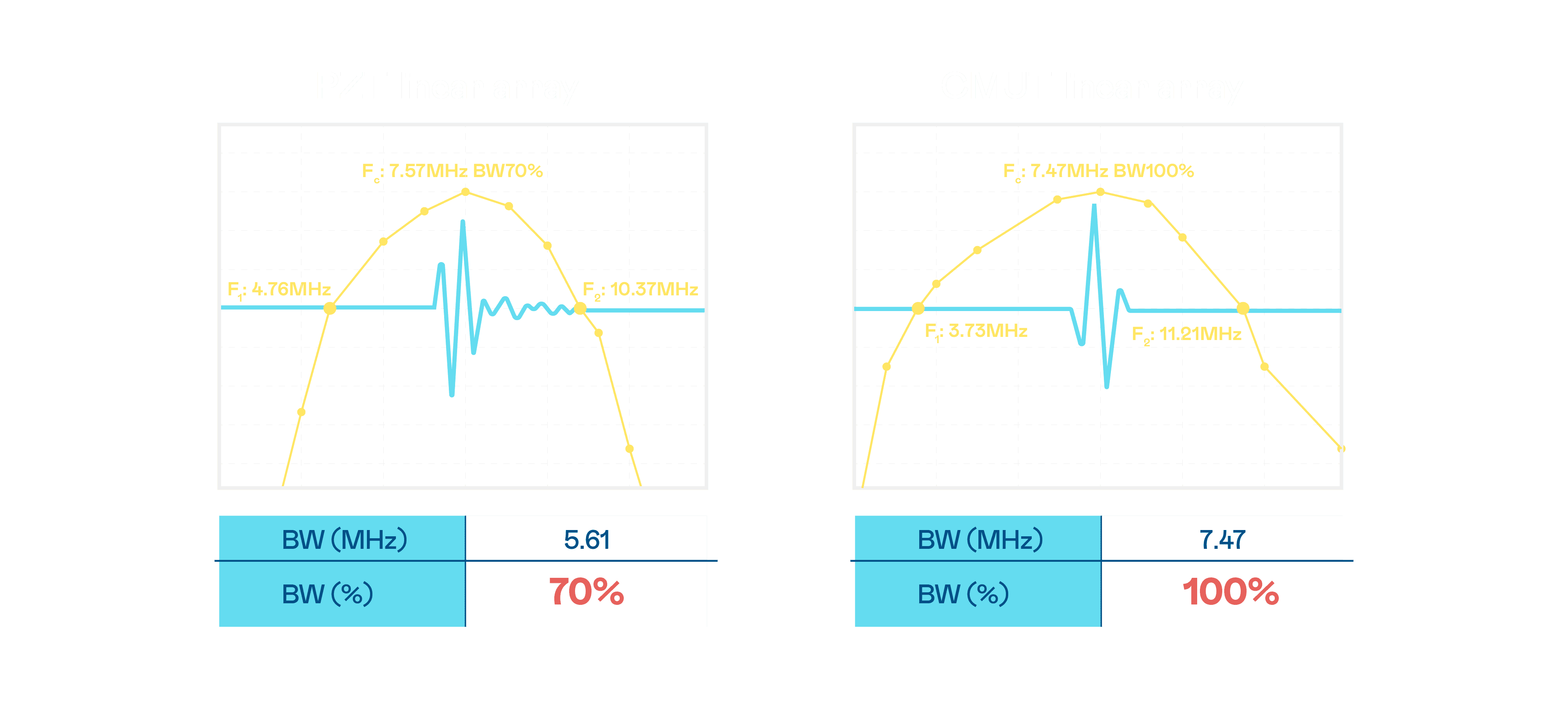 超音波影像的解析度高低,,,,首先取决于探头能发出的讯号频宽。。尊龙集团 CMUT 可提供高清晰的超音波讯号,,,,提供高频宽、、、、高灵敏度、、、、影像纹理细节更高的超音波影像,,协助医护人员缩短影像判读时间及利用精准的医疗影像进行诊断。。。